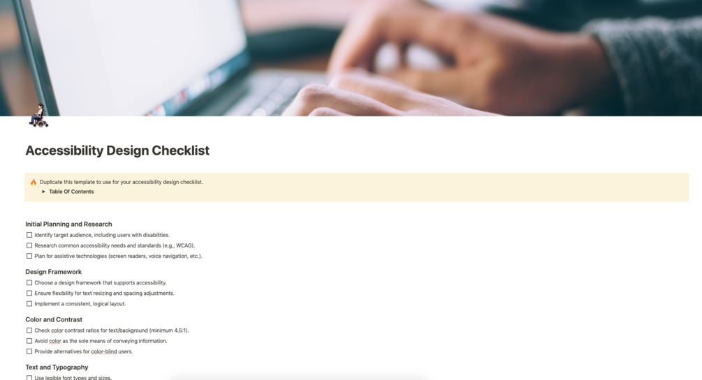 Use this template to use for design planning. See more details at Notion - Accessibility Design Checklist Template.