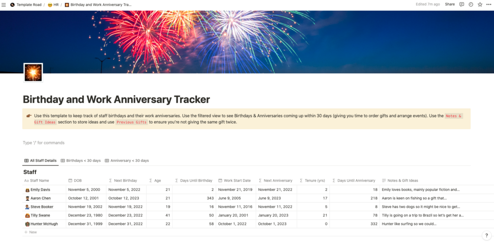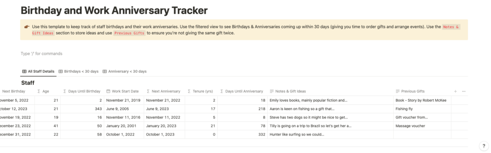 Use this template to keep track of staff birthdays and their work anniversaries. See the full details of the Notion Birthday and Work Anniversary Tracker Template.