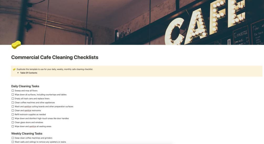 Use this template for your daily, weekly, monthly cafe cleaning checklist. See full details of this Notion - Commercial Cafe Cleaning Checklists Template.