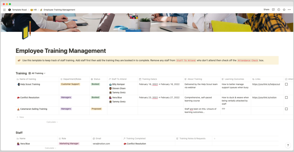 This template is perfect for organising your staff training schedule. From scheduling training sessions for new employees to measuring employee satisfaction, this lightweight training management system will help you manage every step of your employee training and development programs. See the full details of the Notion Employee Training Management Template.