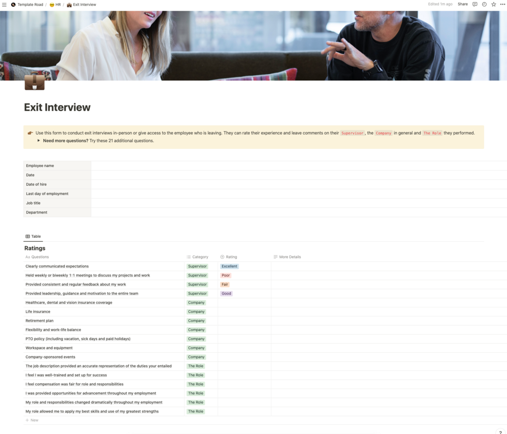 This template is perfect for ensuring you gain valuable insights from exiting employees. See the full details of the Notion Exit Interview Template.