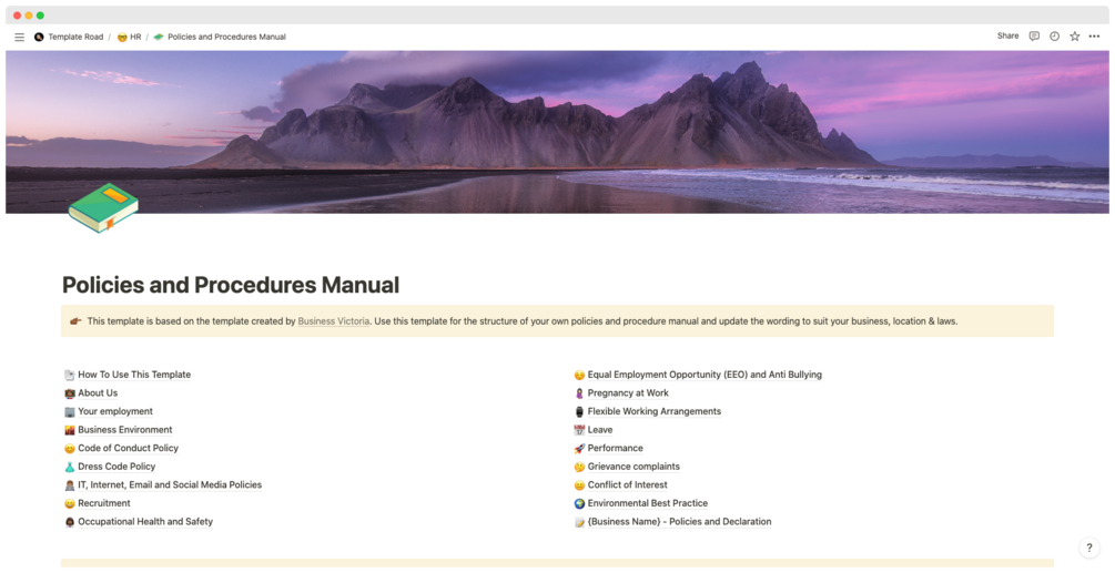 This template is perfect for organising your employees' needs into a central staff manual. Dust off the age-old employee manual for today’s modern workforce! Keep an always up-to-date employee manual that can easily be edited and reorganised in drag & drop. Clearly categorize topics by creating separate lists for benefits, expenses, company policies, etc. and facilitate access to important documents securely. See the full details of the Notion HR Policies & Procedures Manual Template.