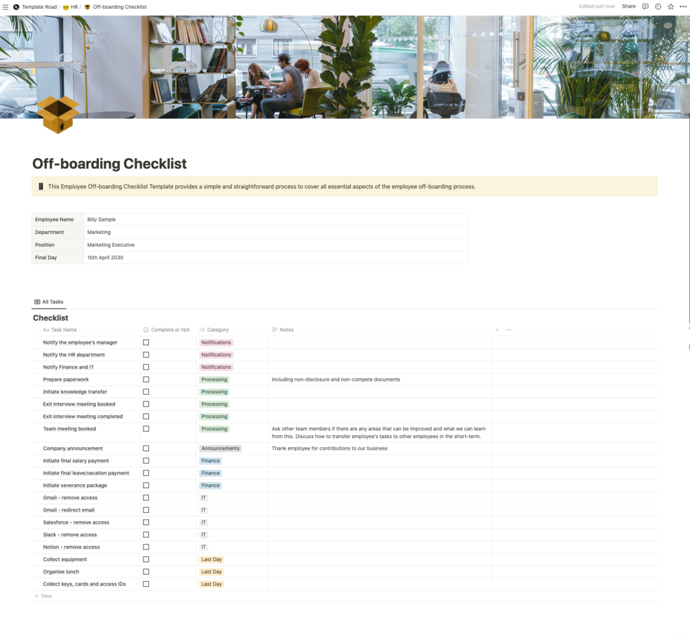 This Employee Offboarding Checklist Template provides a simple and straightforward process to cover all essential aspects of the employee off-boarding process including returning company equipment. See the full details of the Notion - Off-Boarding Checklist Template.