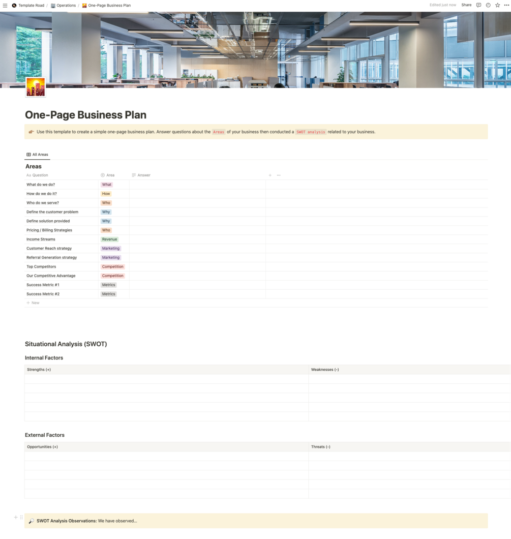 Use this template to create a simple one-page business plan in Notion. See more details at Notion One-Page Business Plan Template.