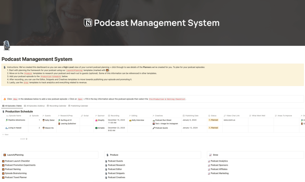 We've built this podcast management system for people who want to launch, produce and grow their podcast. See more details at Notion - Podcast Management System.