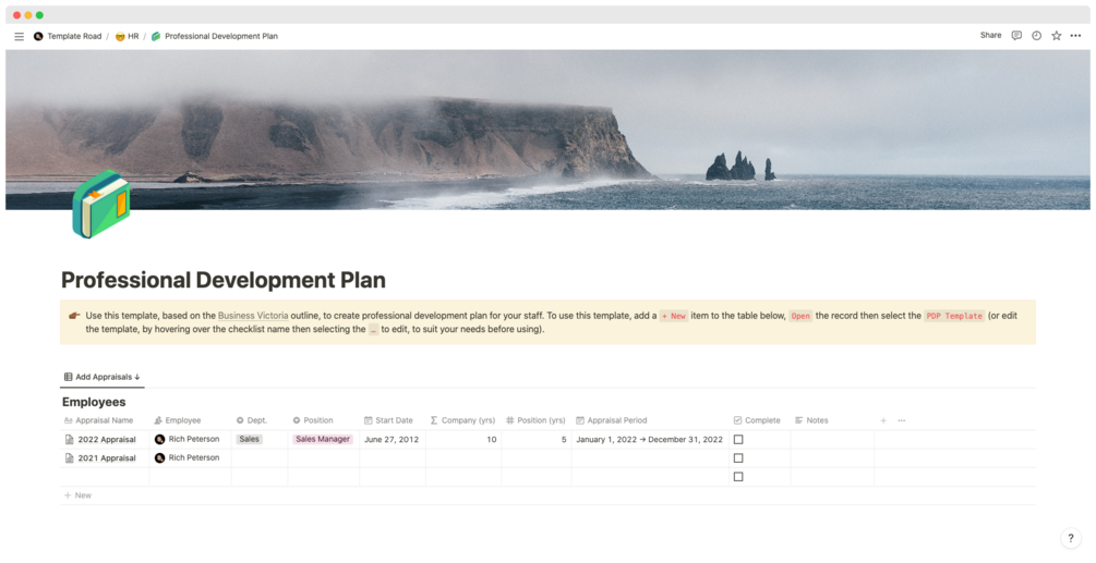 Use our professional development template to list goals for your employee's skills and knowledge development over their career with you. In your performance review meeting, rate their progress in the plan and discuss further opportunities that might help them upskill. Regular professional development plans and updates are useful references when it comes to discussing promotions and pay increases. See the full details of the Notion Professional Development Plan Template.