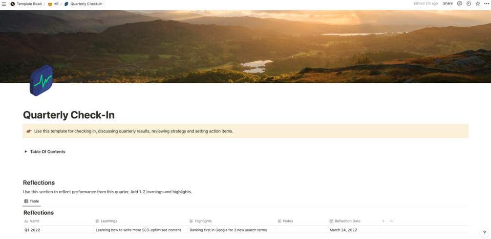 This template is perfect for checking in, discussing quarterly results, reviewing strategy and setting action items. Quarterly performance reviews provide a formalized yet quality conversation between managers and their direct report. They also provide an opportunity to discuss areas of improvement and set goals on a regular basis. See the full details of the Notion Quarterly Check-In Template.