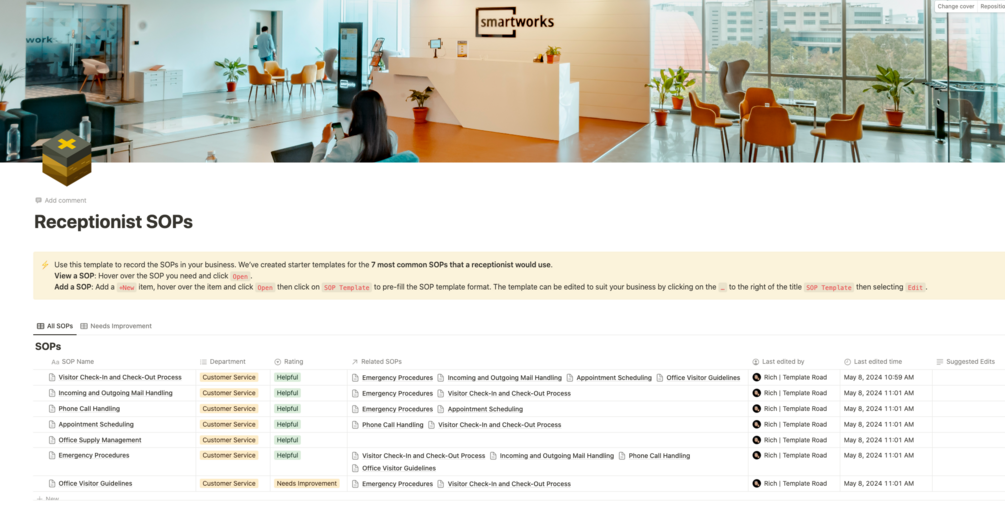 The Receptionist SOPs Template offers a comprehensive set of features designed to support the diverse needs of front desk operations. It includes starter templates for the seven most common SOPs utilized by receptionists, covering everything from greeting visitors and managing appointments to handling mail and emergency procedures. Each SOP is meticulously crafted to provide clear instructions and actionable steps, ensuring that receptionists are well-prepared to handle their responsibilities with competence and confidence. The template is also customizable, allowing you to tailor the SOPs to fit the specific requirements and branding of your business.