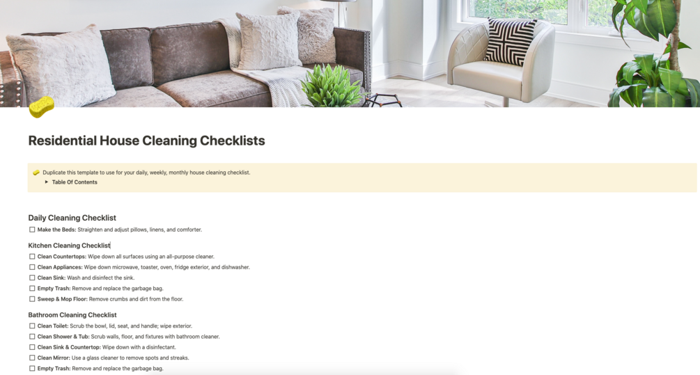 Use this template for your daily, weekly, monthly home cleaning checklist. See more details at Notion - Residential House Cleaning Checklists Template.