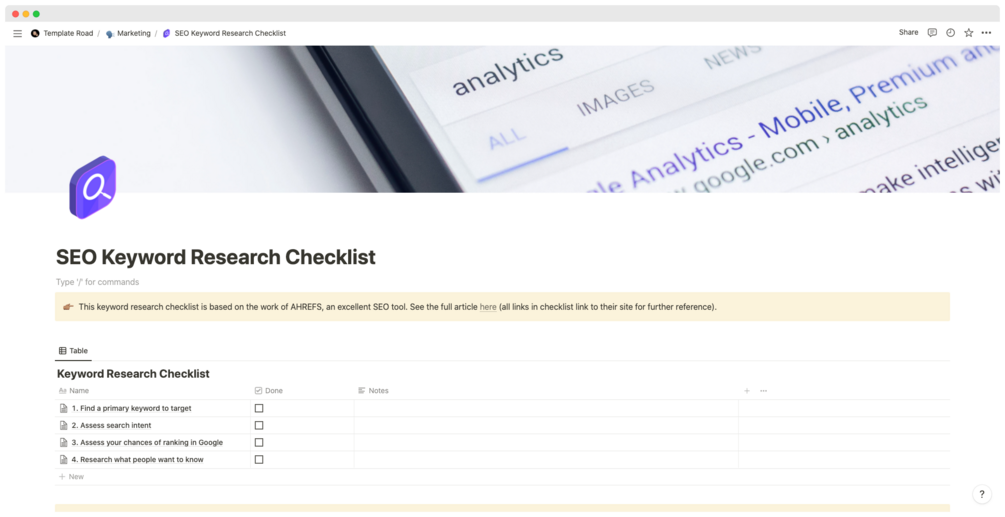 This template is perfect for finding the keywords people are searching for and is based on the work of Ahrefs (links in checklist link back to Ahrefs website). See full details of the Notion SEO Keyword Research Checklist Template.