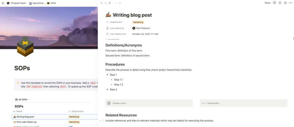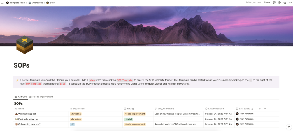 Use this template to create your company SOPs (Standard Operating Procedures) in Notion. See more details at Notion Standard Operating Procedures (SOPs) Template.