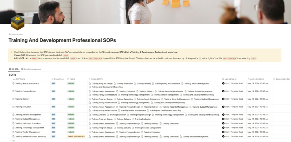 This template contains Standard Operating Procedures (SOPs) for a Training and Development Professional. It covers the entire training cycle, from identifying training needs to evaluating program effectiveness. The SOPs provide step-by-step instructions for needs assessment, program design, delivery, evaluation, and records management. They also address budget management, policy development, technology use, and vendor management. The goal of these SOPs is to establish a systematic and efficient approach to training, ensuring it aligns with organizational goals and objectives while maintaining high-quality standards.